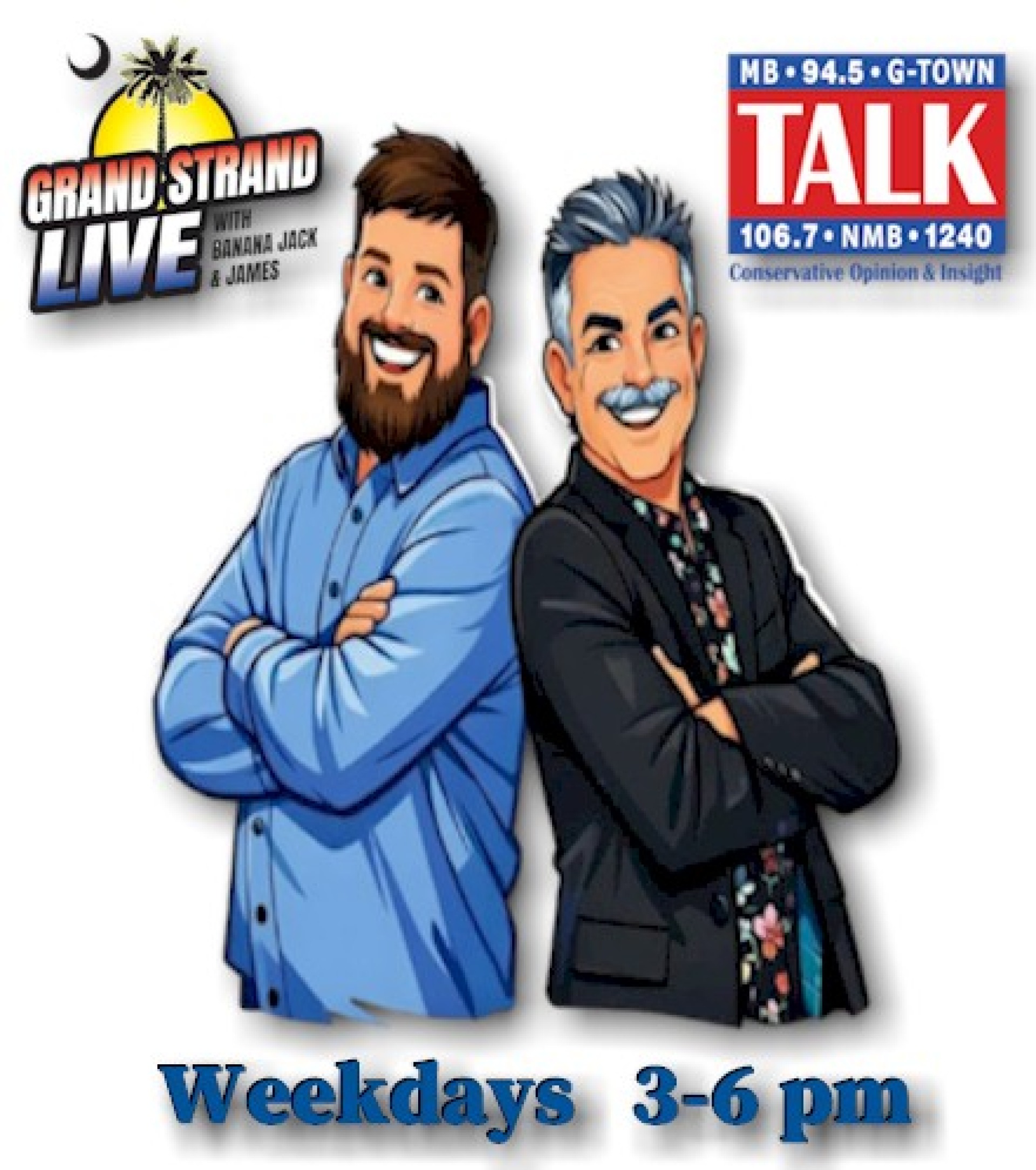 Grand Strand Live, hosted by Banana Jack Murphy and James Bierley, has become "The Grand Strand's Most Listened To Radio Program in The SouthEast!", according to TMZ, The National Enquirer, and many other reputable Supermarket Tabloids. Banana Jack Murphy and James Bierly are two of Myrtle Beach's award winning, critically acclaimed, legendary radio personalities who coincidentally ran into each other at The Horry County Family Courthouse in 2024....so they said. Since our corporate offices have a company wide policy of "Don't Ask, Don't Tell" we quickly move right along, with this elaborate story. Please join Jack and James weekday afternoons from 3-6pm on TALK 94.5 and 106.7. They have a unique style of carefully digging through this political hot mess, and help filter through the garbage force fed to us by the mainstream media. Jack and James are confident you will be entertained, enlightened, and re-educated, or they will cheerfully refund the full price you paid for admission to hear their show.....minus shipping and handling.