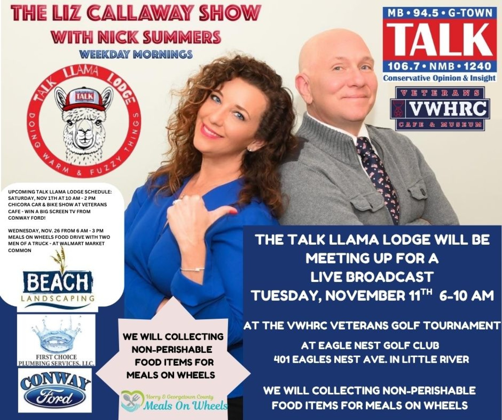 THE TALK LLAMA LODGE WILL BE MEETING UP FOR A LIVE BROADCAST TUESDAY, NOVEMBER 11TH 6-10 AM AT EAGLE NEST GOLF COURSE IN LITTLE RIVER